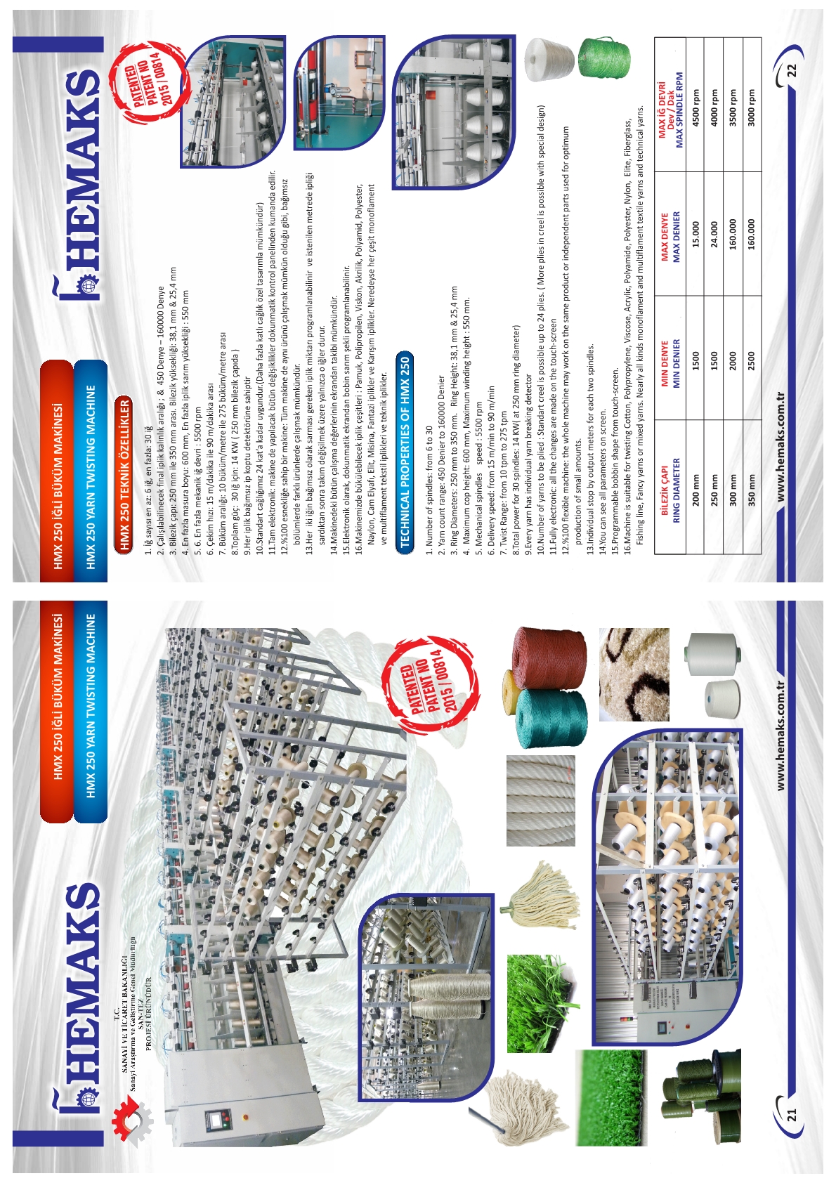 - Makinemizde bükülebilecek iplik çeşitleri: Pamuk polipropilen, viskon, akrilik polyester, polyester, naylon, Cam elyafı, elit, misina, fantazi iplikler ve karışım iplikler. Neredeyse her çeşit monoflament ve multiflament tekstil iplikleri ve teknik iplikler.
